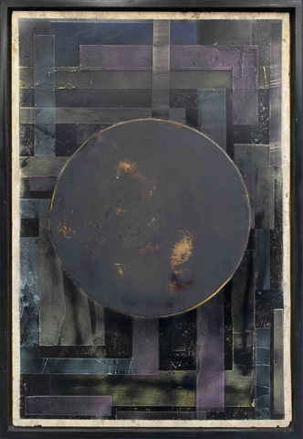 Spackle and lacquer on oriented strand board, artist's frame