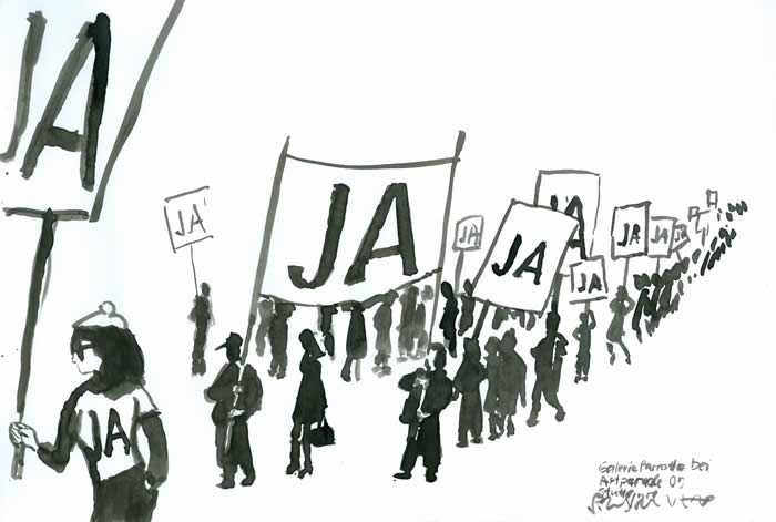 Gemeinsam mit der Stuttgarter Künstlerin Simone Westerwinter beteiligte sich die Galerie Parrotta mit bunten Prozessionsfahnen, die mit einem deutlichen JA für Kunst und Kultur in Stuttgart eintreten, an der Parade.