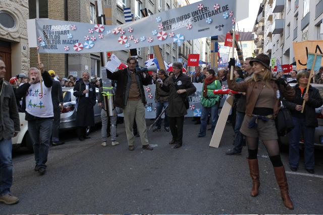 Als Antwort auf die Ankündigung der Stadt Stuttgart, den Kulturhaushalt zu kürzen, hat der Verein kunst08+ e. V. die Stuttgarter Art Parade ins Leben gerufen. Alle, denen Kunst und Kultur in Stuttgart etwas bedeuten, waren aufgerufen, sich zu beteiligen.