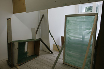 The use of daily roughly worked materials like paperboard, plastic or wood, reconducts to simplified and again easily identifiable linguistic forms. Like in raree shows the installation consists of subsequently ordered coulisse frames, which reinforce the perception of spacial depth. This way the elements of the installation »Landscape with storm« gradually combine to recreate a specific Renaissance's landscape. The coulisse character of the composition finds its counterpart in the particular aspect of the exhibition's space, recalling a theatre stage with its ascending floor. To the viewer watching from the outside into the gallery room the installation appears like a flat picture. To those who enter the room a more complex landscape discloses: single elements become slowly visible, the picture demounts as the installation's hidden skeleton is unveiled to the public view. This way »Landscape with storm« becomes a transition point between installation and picture, between a planar and a three-dimensional perception.