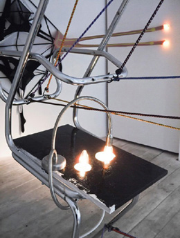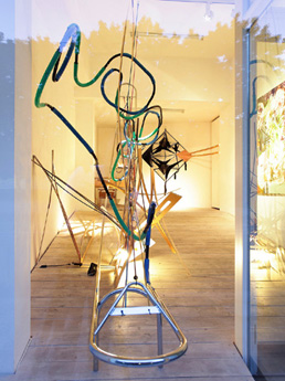 Die Berliner Künstlerin Isabel Kerkermeier verwendet für ihre installativen Objekte industriell produzierte Gegenstände wie Stahlrohrmöbel und Werbebanner, die eigentlich am Ende ihrer Nützlichkeit angekommen sind. Rekombiniert mit bunten Seilen, Nylonstrümpfen und Expandern werden sie zu Skulpturen und Wandobjekten. Da die Neukonstruktion nachvollziehbar ist, bleibt die Anmutung des Mobiliars unweigerlich erhalten und stellt vertraute Bezüge zum menschlichen Körper, seinen Proportionen und Bewegungen her, während die ursprünglichen Reklamebotschaften der Banner zu neuen, ästhetischen Inhalten verdichtet, vermischt und zerfasert werden. Gleichzeitig geraten die elegant und filigran ausgreifenden Objekte aber selbst in Bewegung. Sie verlieren ihre technoide Sprödigkeit und materielle Schwere und schweben als rhythmische Form- und Farbassemblagen im Raum. Die Kunststoffbahnen und bunten Seile bilden ein dichtes Geflecht aus Linien und Flächen, das sich quasi nahtlos in die assoziative Vielschichtigkeit der Gemälde fortsetzt. Bettina Schönfelder.