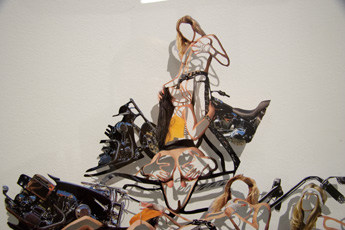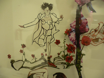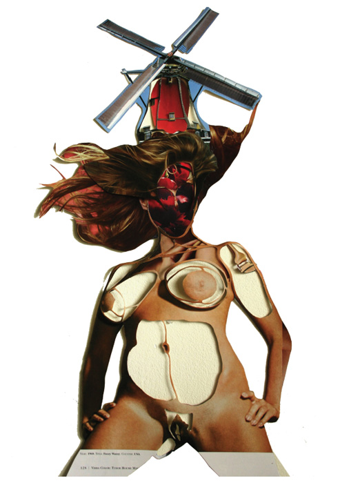 The Themes of Lidy Jacobs, born in 1959 in Heerlen, The Netherlands, circle around obscene and childhood repressions of our society. This is shown in her work through a combination of collage and silhouette, in photography as well as in sculpture. The visual material she uses for her collages come from sexually loaded advertisements and pornography magazines. In these works she cuts out the individual bodies in a special style in which they become objectified. The emerging contour forms of the body images in these large collages, interweave with one another into a seemingly endless network. In releasing the boundaries between the individual body frameworks, which are pushing and intruding into one another, a new organic unity emerges.