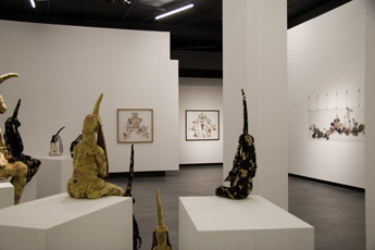 Lidy Jacobs' Sculptures are stuffed animals. Different from the gender-free models, in which one finds in certain societal norms, Lidy Jacobs' sculptures are sexualized.Even if her elaborately designed stuffed animals are not taken from any world which is familiar to us from our childhood, they nevertheless point back into our infancy and show thus clearly the repressed parts of psychological processes of early childhood in an adult. In her installations, Lidy Jacobs creates scenes which with the first glance appear infantile, yet these libidinous structures refer to something that she accepts as fundamental in our society.
