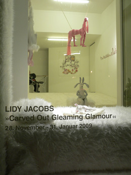 In ihren Installationen schafft Lidy Jacobs Szenerien, die auf den ersten Blick infantil anmuten, dann jedoch auf libidinöse Strukturen verweisen, die sie in der Gesellschaft als grundlegend annimmt. Gegenüber der Intimität der Berliner Installation erscheint die “Sacra Conversazione“ der “Unicorns“ in Stuttgart auf übergroßen Sockeln platziert geradezu monumental. Statuesk und doch innerlich tief bewegt erscheinen die Apostel des in der Mitte thronenden Christus. In ihrem ornamentalisierten Brokatfell gelingt es diesen Fabelwesen, die in der christlichen Ikonografie als Symbol Christi gelten, eine Referenz zur eingefrorenen Bewegtheit und geradezu natürlichen Künstlichkeit der Barockkunst herzustellen. Zieht man andere sich auf das Fabelwesen Einhorn beziehende Vorstellungen heran - wie seine Verkörperung des Spirituellen bei den Rosenkreuzern, seine Platzhalterfunktion für Thematisierungen der Reinheit und Jungfräulichkeit als auch sein Auftauchen in erzählerischen Kontexten immer dann, wenn auf eine Aufhebung der Gegensätze bezug genommen wird, da man im Einhorn eine Vereinigung des phallischen Prinzips mit der Unschuld repräsentiert sieht - wird deutlich, dass es Lidy Jacobs immer auch um den erotischen Subtext religiöser Erfahrung geht, wie auch um das Verhältnis derselben zu einem religiösem Subtext erotischer Erfahrung.