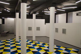 Mittels elementarer Formen konstruiert Tim Stapel grafische und malerische Reihungen, die sich zwar einer zentralperspektivischen Anlage von Raum entgegenstellen, aber dennoch in den perspektivischen Raum vordringen. Neben der Reduktion auf streng komponierte Raster begünstigt der kalkulierte Einsatz von Farbe und isometrischer Parallelperspektive ein permanentes Vor- und Zurücktreten einzelner Formen – eine Dichotomie der Sichtweisen. Für die Galerie Parrotta hat der Künstler eine Bodenarbeit entwickelt, die sich an der Grenze von zwei- und dreidimensionalem Objekt bewegt: Als textiles Gewebe nimmt sie realen Raum ein und behauptet sich dennoch auch als Bildfläche, als ein bildhafter Ausgriff in die dritte Dimension. »Als Maler bin ich an Bildern interessiert. Allein die Tatsache, dass das Bild auf dem Boden liegt, ist für mich spannend. Die Verlagerung des Bildes aus seiner Frontalansicht lässt es verstärkt zu einer Fläche, zu einem Feld aus Längen und Breiten ohne (Bild-)Tiefe ausdehnen. Die flache Fläche stellt andere Anforderungen an das Bild und zwingt zu einer Neubewertung des malerischen Raums. Der räumlichen Situation ausgesetzt entwickelt das Bild gleichzeitig skulpturale Eigenschaften. Es öffnet sich in den Raum und stellt eine Mehransichtigkeit der Bildfläche her. Die Bildstruktur zeigt sich so in unterschiedlichen Form- und Farbkonstellationen. Der perspektivische Bildraum multipliziert sich mit seinen perspektivisch verkürzten Ansichten.« Von einfachen Systemen ausgehend werfen die formstrengen Arbeiten Tim Stapels in ihrer visuellen Vieldeutigkeit nicht abgegoltene Fragen der Konkreten Kunst neu auf. Geprägt wurde der Begriff 1930 in einem Manifest von Theo van Doesburg: Das Bild soll ausschließlich aus plastischen Elementen, d.h. aus Flächen und Farben konstruiert werden und keine andere Bedeutung als sich selbst haben. Trotz konsequenter Reduktion bildnerischer Mittel verweigern sich die Arbeiten Tim Stapels einer solchen Selbstbezüglichkeit. Die elementaren Formen zeigen nicht nur die Abhängigkeit vom Raum und Betrachterstandpunkt, sondern auch eine Aufhebung ihrer perspektivischen Eindeutigkeit.