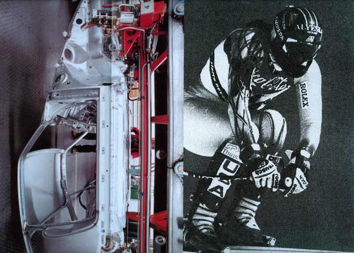 Die Darstellung der Realität weiß um die Realität der Darstellung, wenn Timm Rautert in seinen Bildpaaren eine seiner Fotografien aus dem Porschewerk mit der Fotografie eines Werbeplakates verbindet, das einen Skirennfahrer in rasender Geschwindigkeit im alpinen Wettkampf zeigt. Durch die Verknüpfung der Fotografie verkabelter Montagemaschinen des Porschewerkes mit dem Image einer menschlichen Maschine in Hochgeschwindigkeit, von potenzierter Kraft und Unverletzbarkeit, werden die narrative Struktur und die mögliche symbolische Bedeutung des Einzelbildes gebrochen und neue Beutungsmuster scheinen auf. In seiner Pixelstruktur weist sich die Fotografie des Rennfahrers - vollends referentiell - als Bild eines Bildes aus und dabei scheint etwas jenseits der Koordinaten auf, das indifferent bleibt und der Beschreibung trotzt.